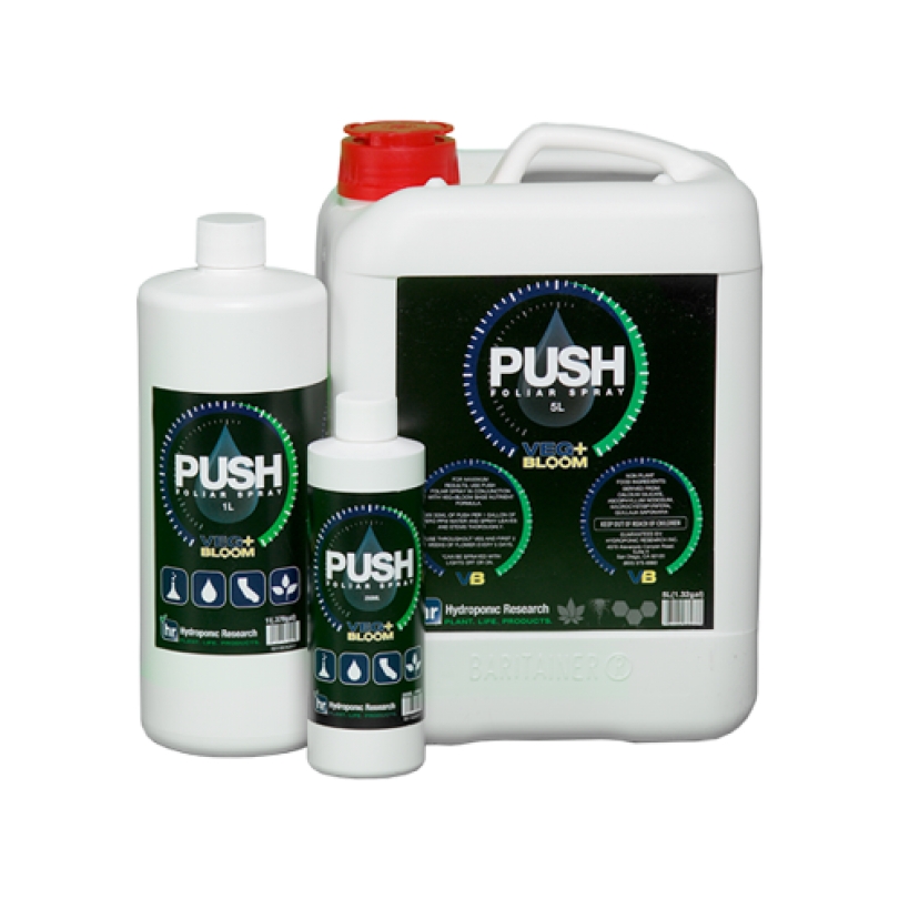 Containing plant available silica, calcium, kelp extracts, hormones and root extracted surfactants, Veg + Bloom Push Foliar is able to increase the plants demand for cell division, leading to faster green growth during the vegetative period and strong, compact plants at the start of flower leading to plants that are able to yield more come harvest time.